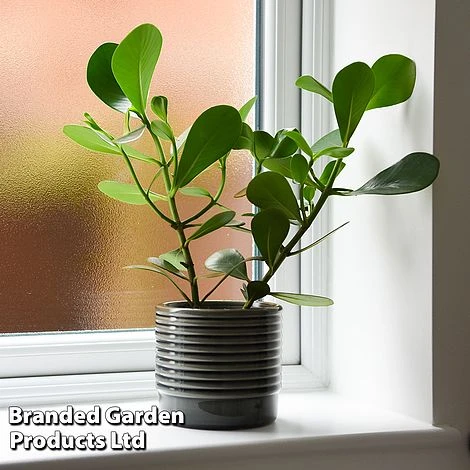 In its native Caribbean, this robust tropical shrub is a bit of a monster, growing off trees and eventually strangling its host. Fortunately, it won’t do this indoors! But plants are quick growers and small window sill specimens can eventually grow several feet if regularly re-potted. It bears handsome, leathery, deep green leaves about 6 inches long. The leaves are so thick, it’s possible to engrave your name on them and watch them grow, hence its nickname: The Autograph Tree. In the Caribbean, the leaves were once engraved with numbers and designs and used as cheap playing cards! Maximum height: 1.5m (60in). Spread: 60cm (24in).