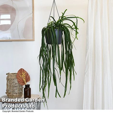 Native to the Bolivian rainforest, where it grows on trees and rocks, Lepismium bolivianum is an intriguing spine-free trailing cactus. This unusual houseplant forms a cascade of flat, fleshy foliage that tumbles over the side of its hanging pot, and may bear pinkish white flowers. Forest cactus is very easy to care for, packing a tropical punch for little effort. Height: 120cm (47in). Spread: 30cm (12in).